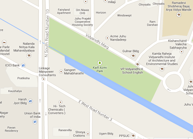 Kaifi Azmi Park is located at one of the premium real estate places in Juhu. As shown in the map, its a long stretch of land and besides it is a nullah. For a really long time this piece of land was neglected and was used as a garbage dumping ground, cars repairing places, etc.